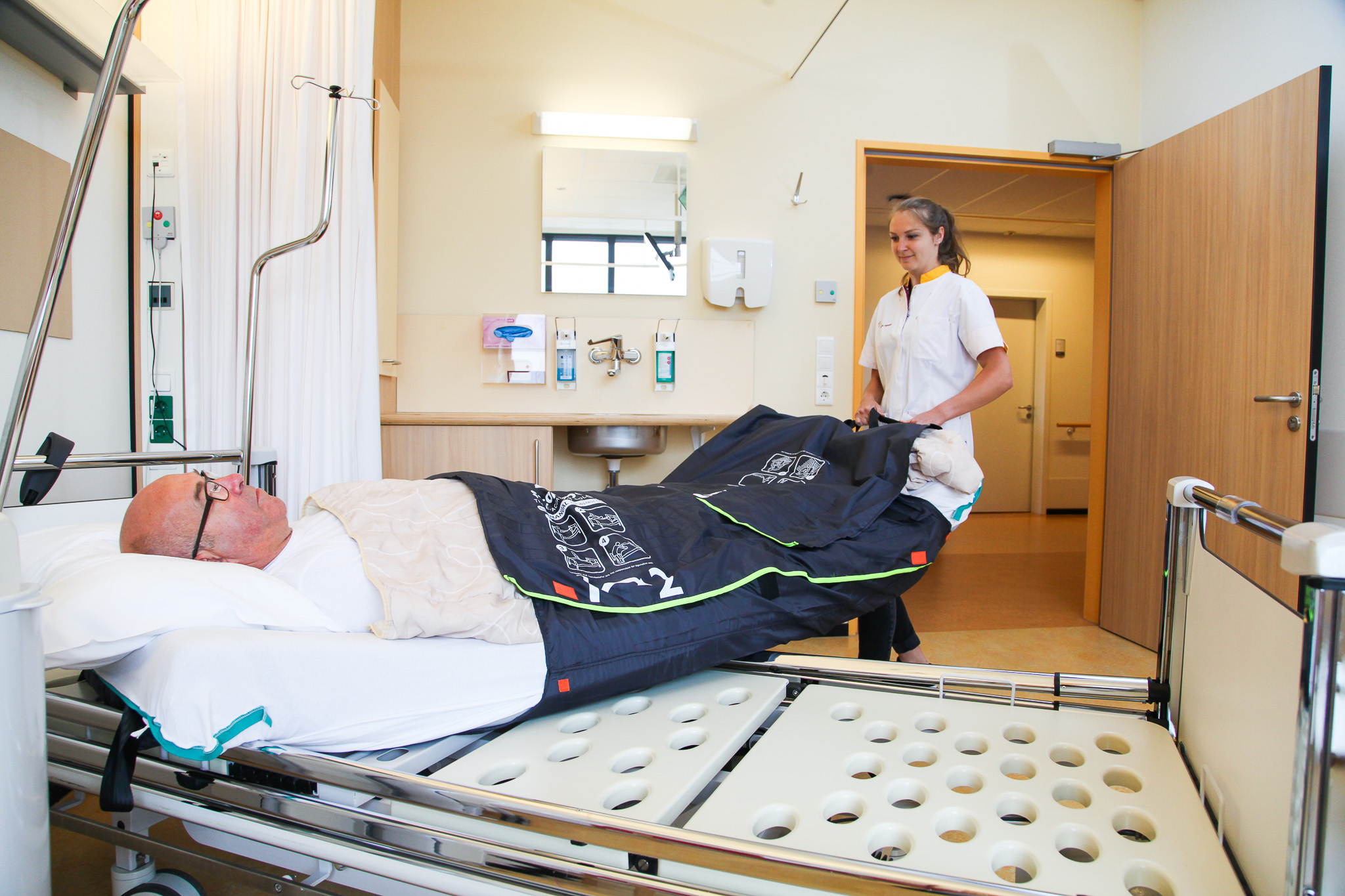 Standard model utilising unique material flaps to envelop the occupant and mattress to allow an extremely safe and controlled evacuation of the person without the need to move them from their bed mattress.